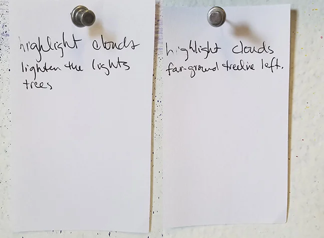 One of my favorite things to do while painting is listen to podcasts. I was listening to my current obsession, Happier, and they were interviewing the host of anther favorite, Note to Self, and I thought, Aha! Voila. I have hacked my studio process(es) and have a new, over-arching method that works: Notes to Self. Yay, me. :)