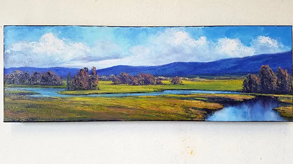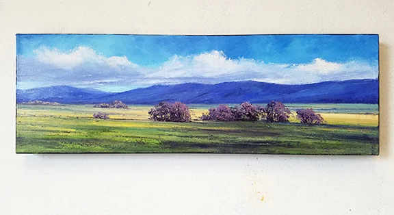 In any case, one thing that plagues all of my methods, with the possible exception of Section by Section, is Forgetfulness. I really hate this method, but it loves me. I think to myself, Now don't forget to put a treeline in over there. And I do remember... later, after the painting has been photographed, varnished, signed, and is hanging on a wall somewhere. Why not do it in the moment, you might ask. Fair question. Well, possibly, the paint is too thick/wet to take another layer, or I need to paint something else first, or I'm scrambling to wrap up so I can go pick up my kids, or the palette is full of paint so I don't have room to mix it. Whatever. I have simply gone on doing the same thing (talking to myself) and getting the same result (forgetting).